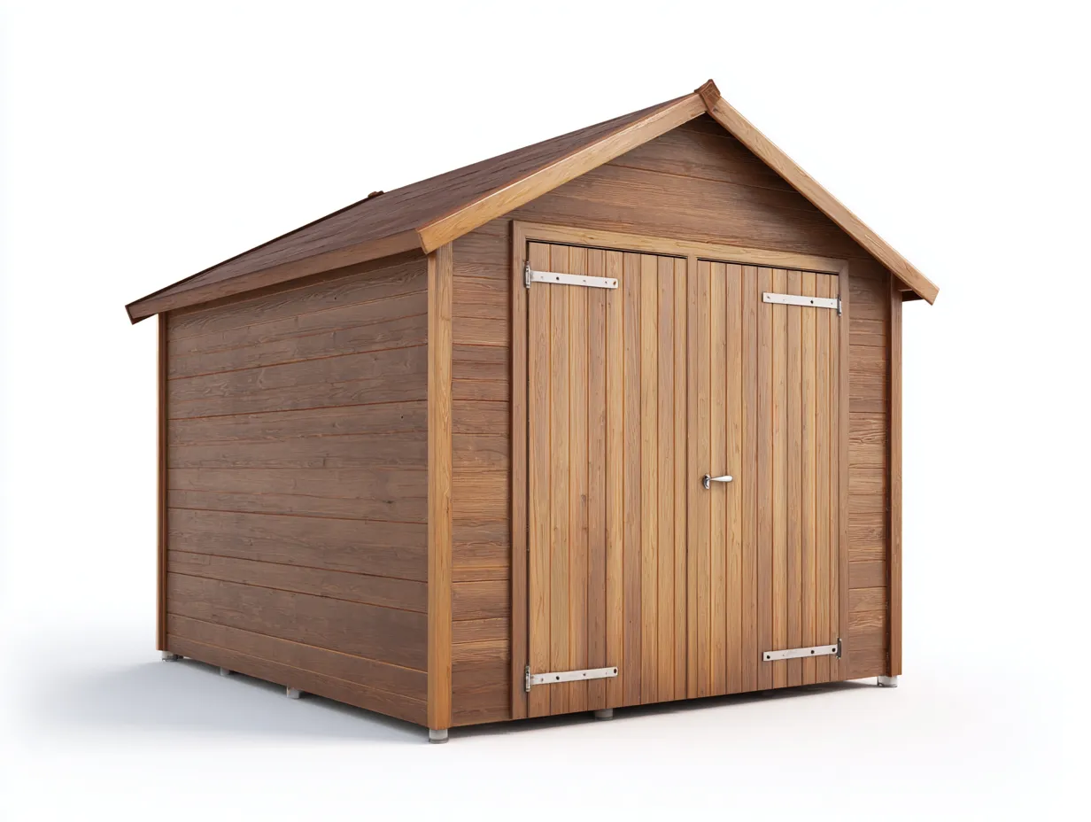 La estructura está fabricada en madera maciza con acabado en color madera natural que resalta la textura del material. Los paneles laterales están diseñados para ofrecer estabilidad estructural y una buena resistencia al uso exterior. Las bisagras metálicas de las puertas proporcionan un sistema de apertura firme y seguro.