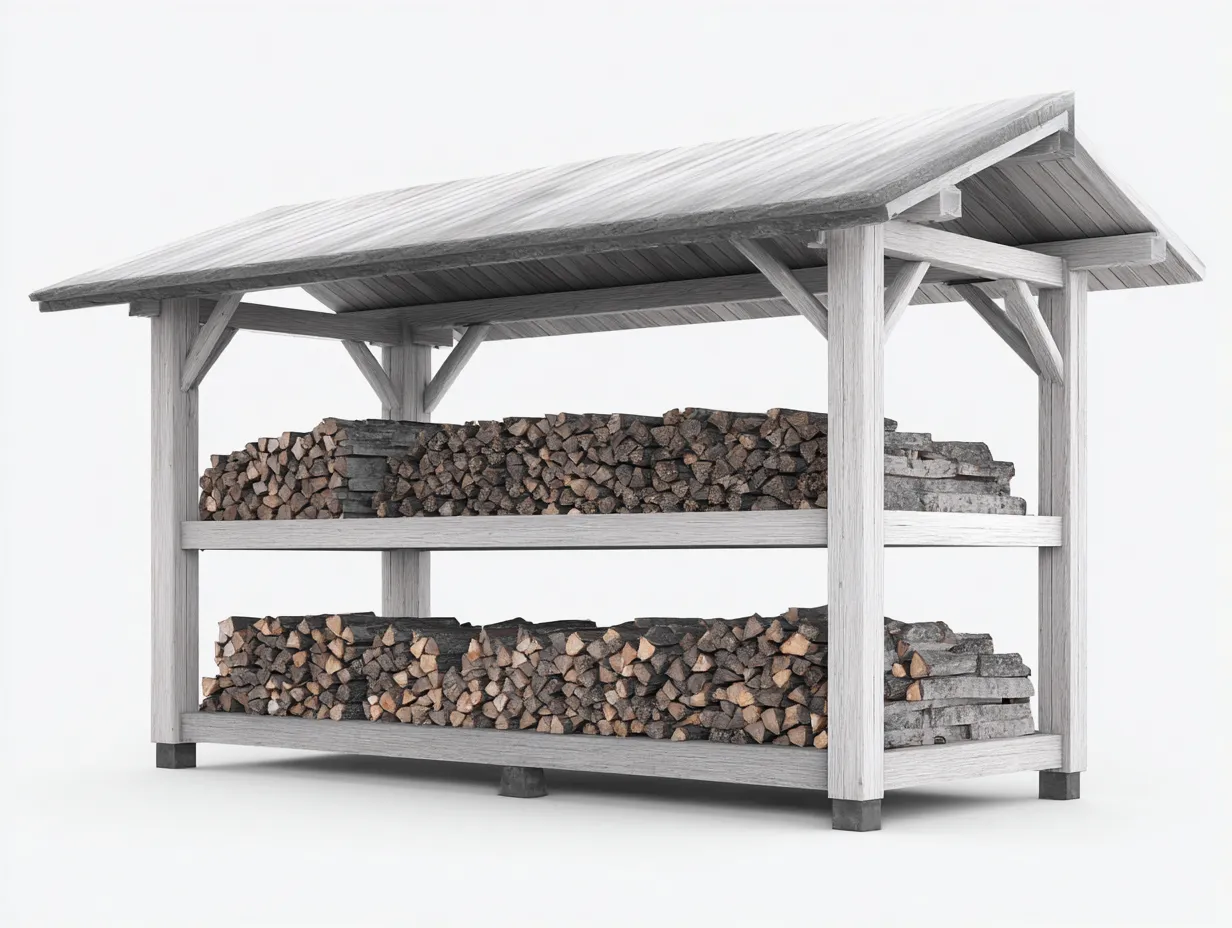 El diseño elevado permite mantener la leña separada del suelo para mejorar la circulación del aire. La estructura abierta facilita el acceso y la organización de la madera, mientras que el techo inclinado ayuda a desviar el agua de lluvia.