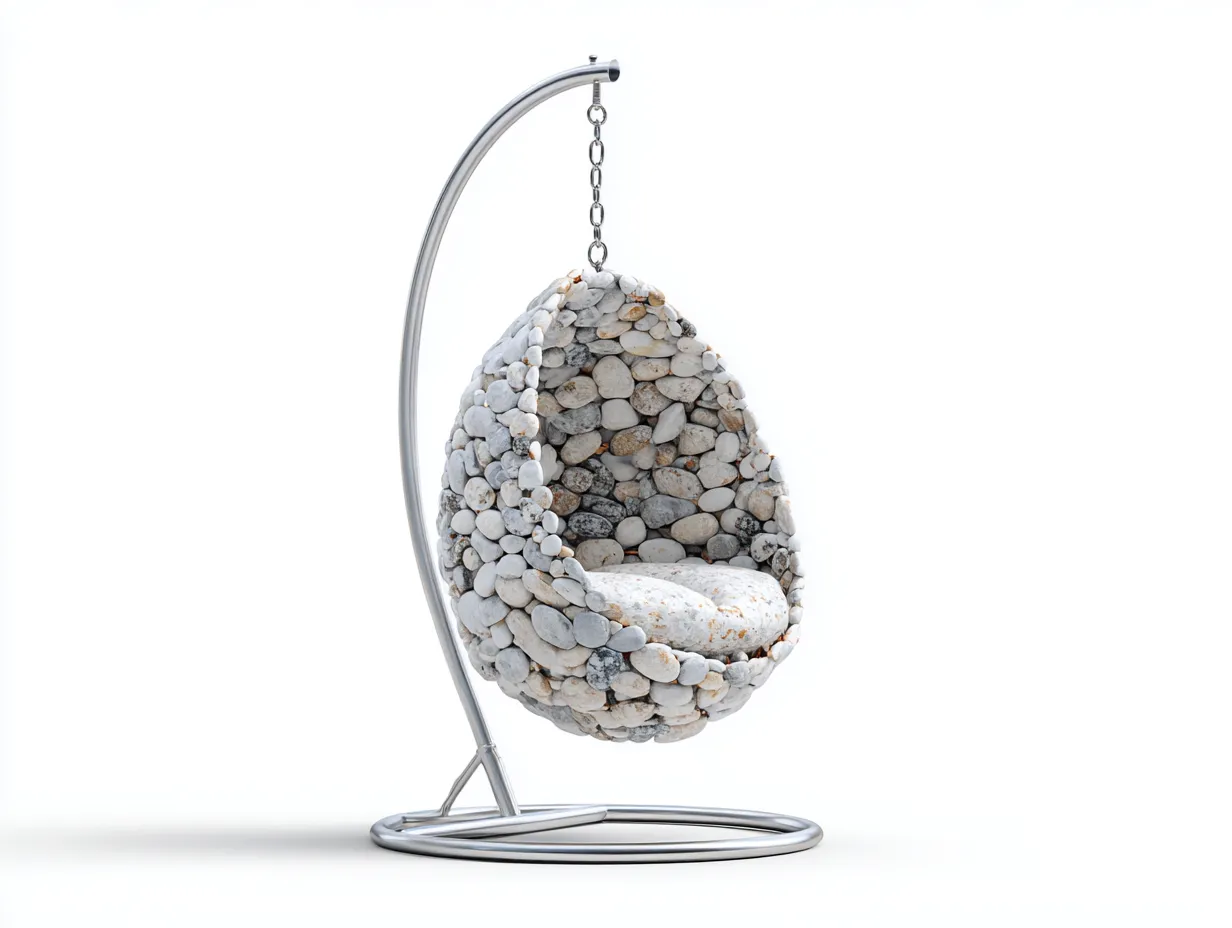 La estructura incluye un soporte metálico resistente que garantiza estabilidad durante el uso. El asiento presenta un acabado decorativo con textura inspirada en piedras naturales en tonos gris y blanco mientras que el cojín interior ofrece una superficie cómoda para sentarse.